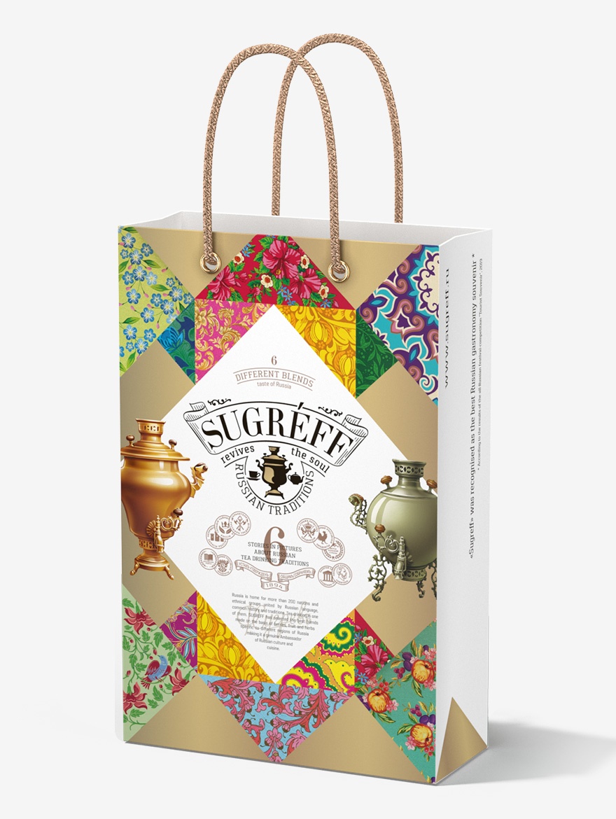 Подарочный набор из шести эксклюзивных купажей листового чая, трав и ягод, характерных для разных регионов России, в стильном саше из ламинированного картона с выборочной лакировкой и ручками из плетёного шнура. На оборотной стороне саше изображены представители различных этнокультурных групп в традиционных костюмах с подписями на английском и русском языках.