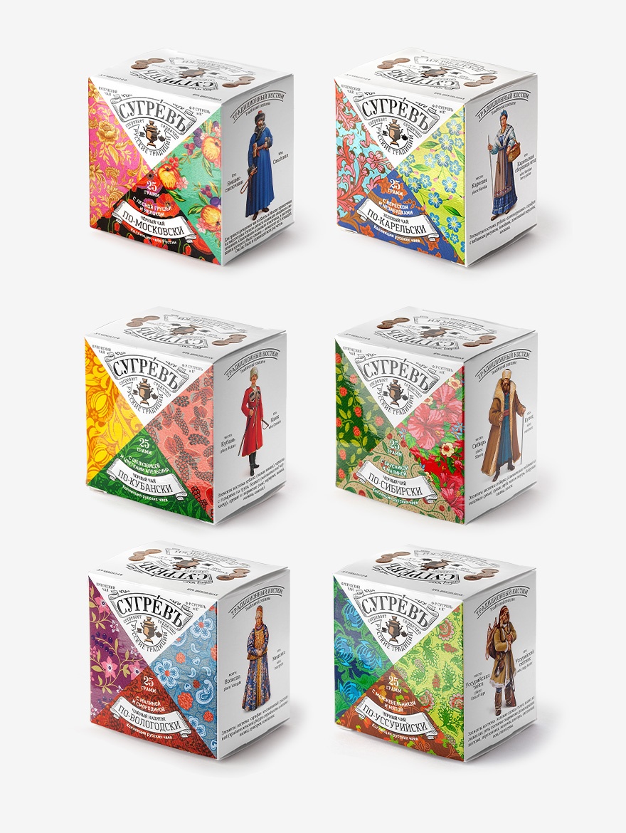 Внутри — ассорти из шести чаев: от насыщенных чёрных с ягодами до деликатных зелёных с лепестками и травами. Каждая смесь — это отдельное маленькое путешествие по регионам России: по‑Московски, по‑Карельски, по‑Кубански, по‑Сибирски, по‑Вологодски, по‑Уссурийски.