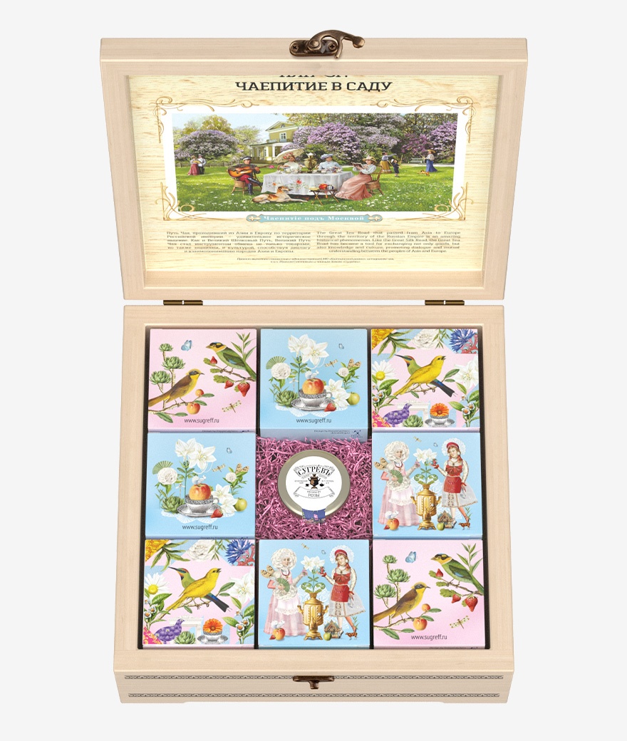 Купажи цветочных чаев составлены так, чтобы сочетать вкус и аромат отборных сортов китайского и индийского чай с красотой разноцветных лепестков календулы, мальвы, цветов яблони, персика, жасмина, апельсина, акации. Ягодно-фруктовые десерты гармонично дополняют набор.