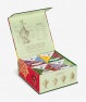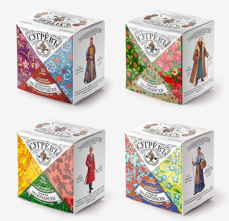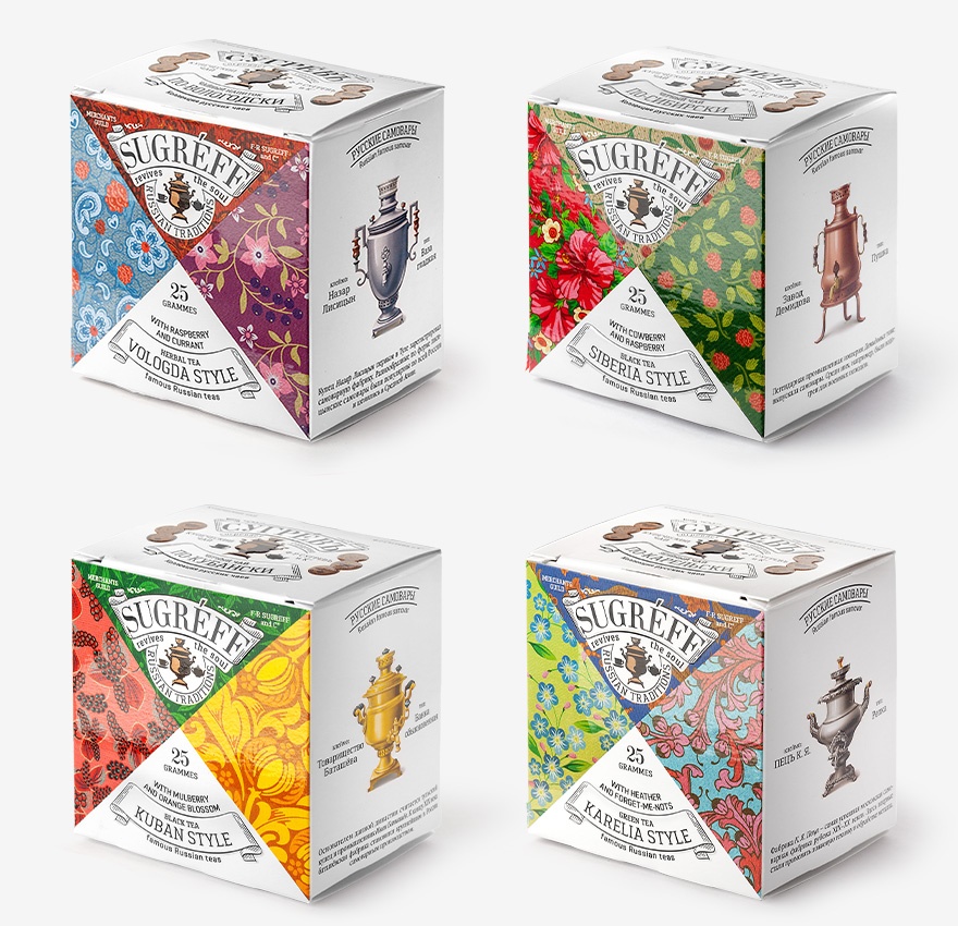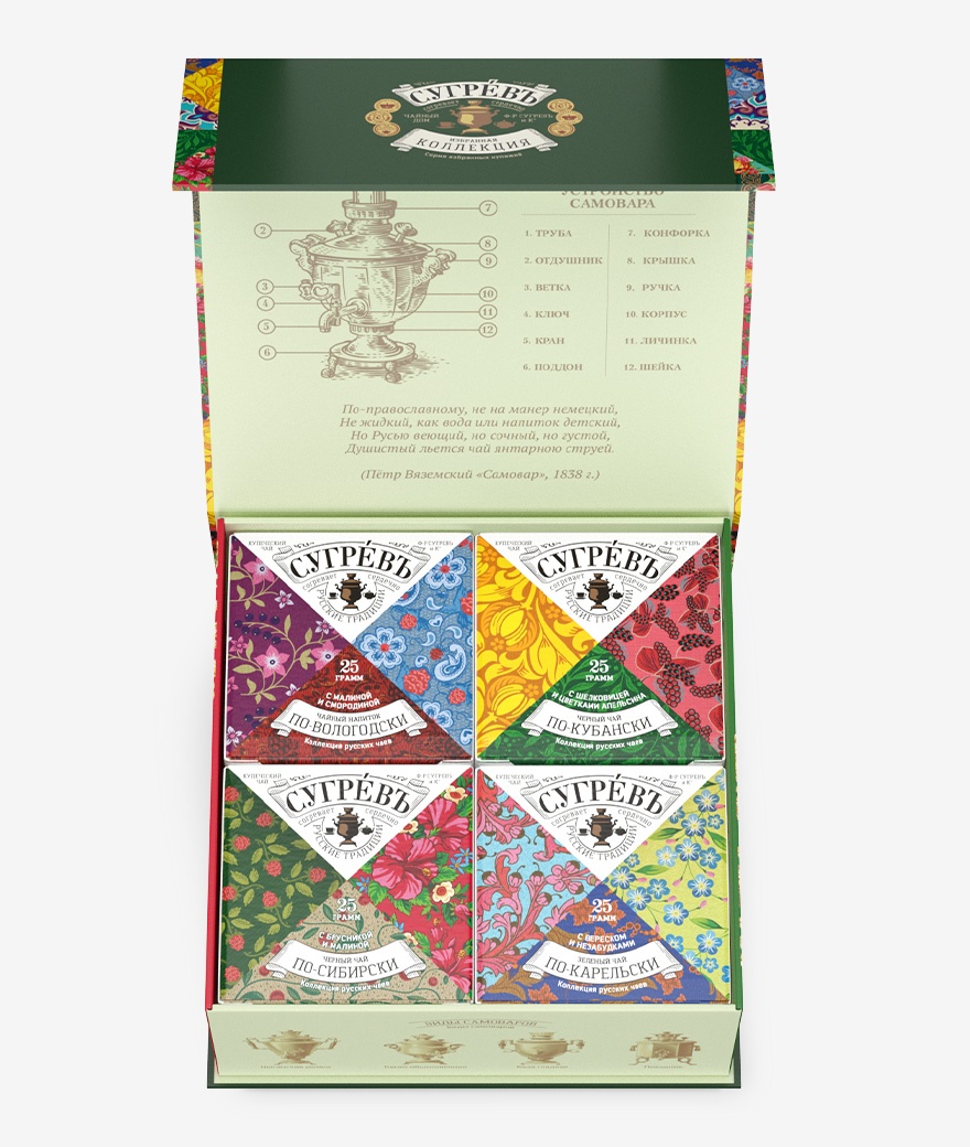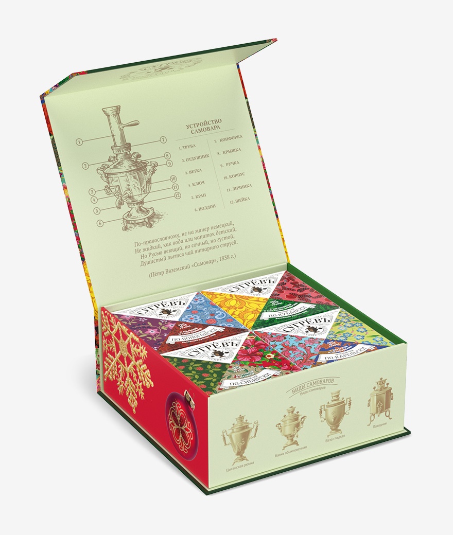 Подарочный набор из четырёх эксклюзивных купажей листового чая, трав и ягод, характерных для разных регионов России, в сувенирной новогодней шкатулке из переплётного картона с магнитным клапаном. Содержит подробную схему устройства русского самовара на русском и английском языках.