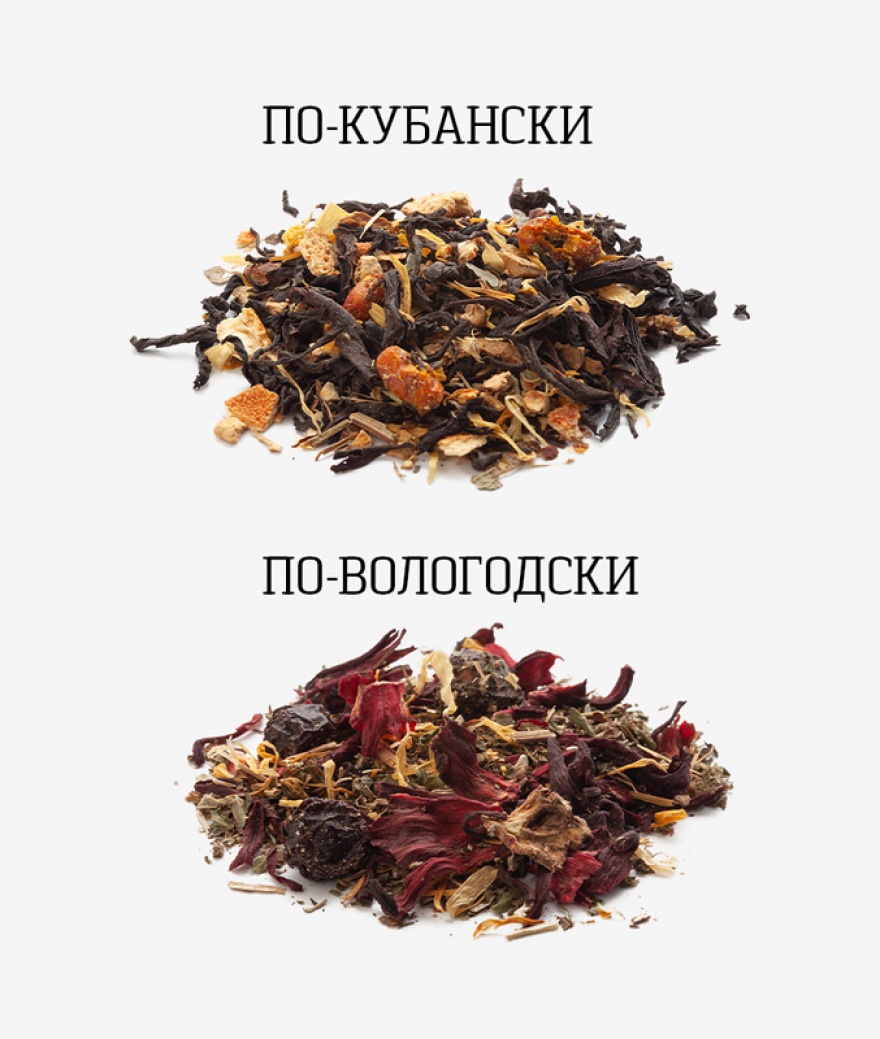 По-кубански: чай чёрный байховый, лепестки календулы, ягоды облепихи, имбирь, цветки апельсинового дерева, шелковица.