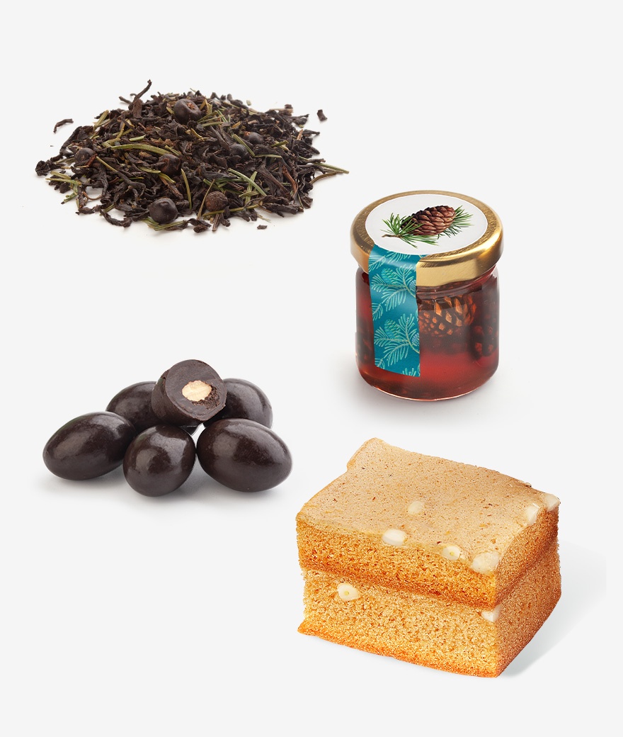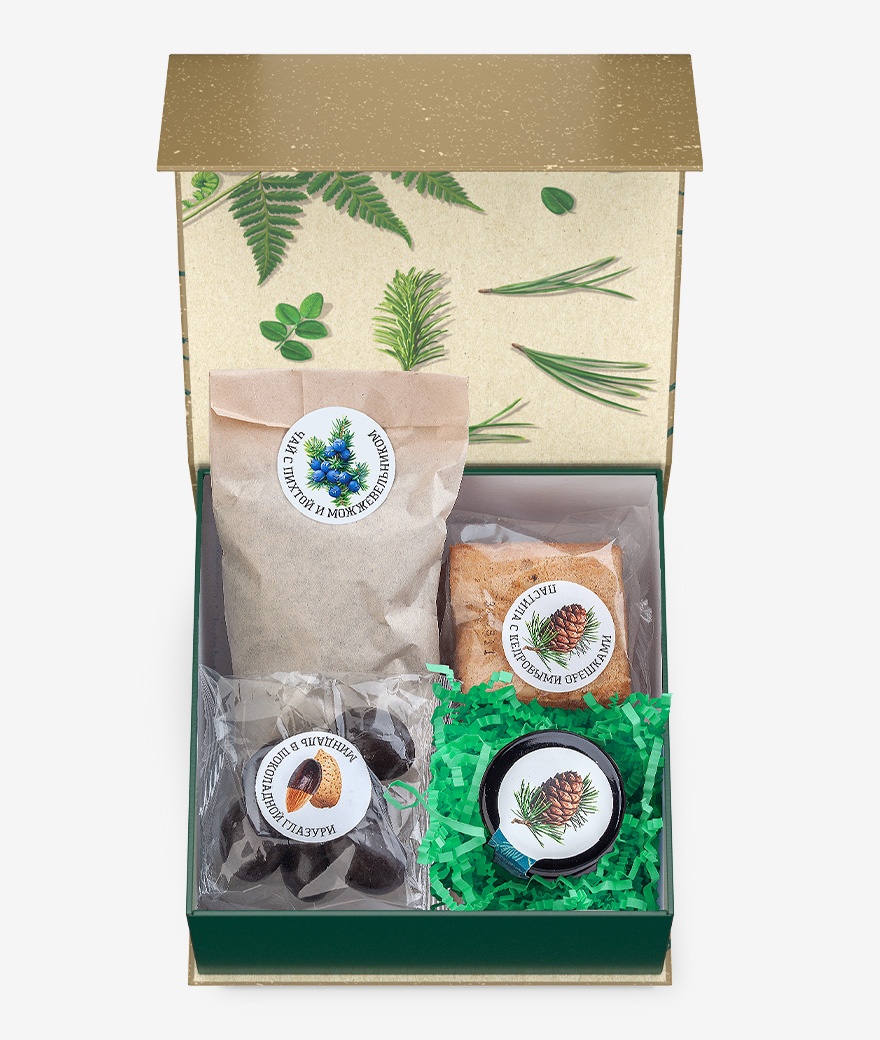 Состав набора: чай с хвоей пихты и ягодами можжевельника (50г); варенье из шишек (40г); пастила с кедровыми орехами (50 г); миндаль в шоколадной глазури (40г).
