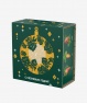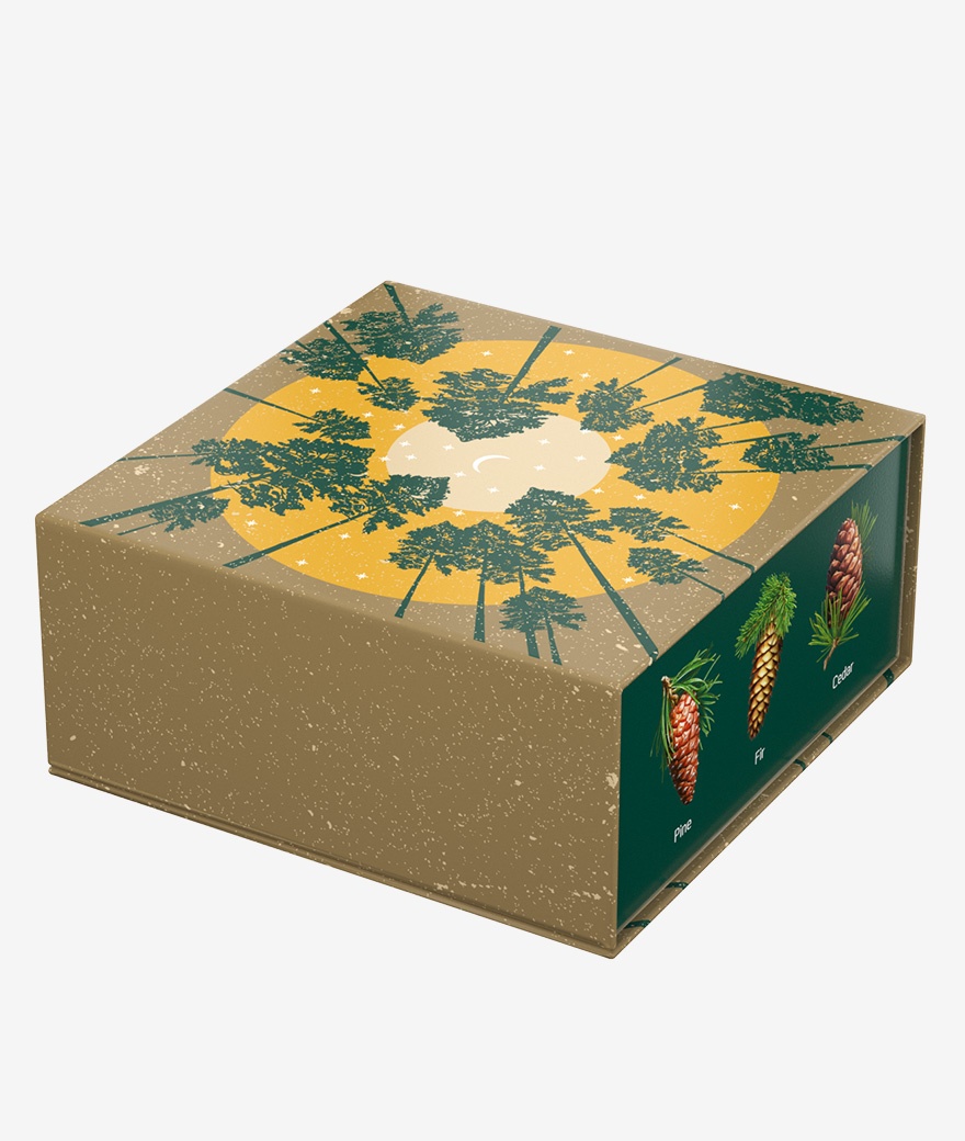 Аромат и вид хвои – символ Рождества и Нового года. «Хвойная» шкатулка «С сосновым годом!» оформлена праздничным паттерном и изображением шишек разных хвойных деревьев. На крышке шкатулки помещена иллюстрация, изображающая вид снизу вверх на звёздное небо и уходящие ввысь сосны. При надевании на шкатулку шубера (суперобложки) с круглым отверстием, на крышке шкатулки появляется вырубное изображение новогоднего шарика.