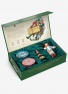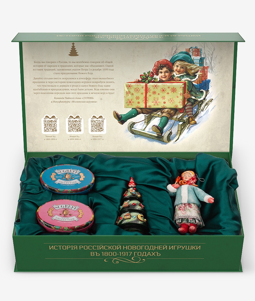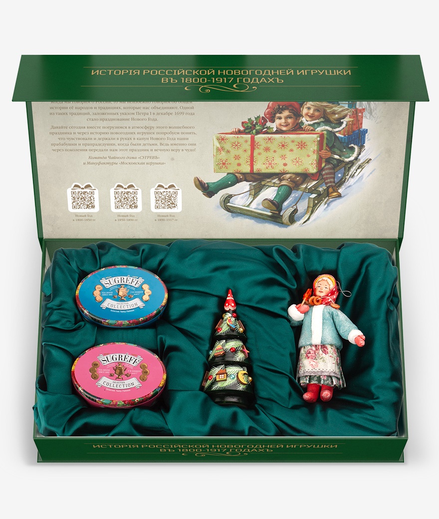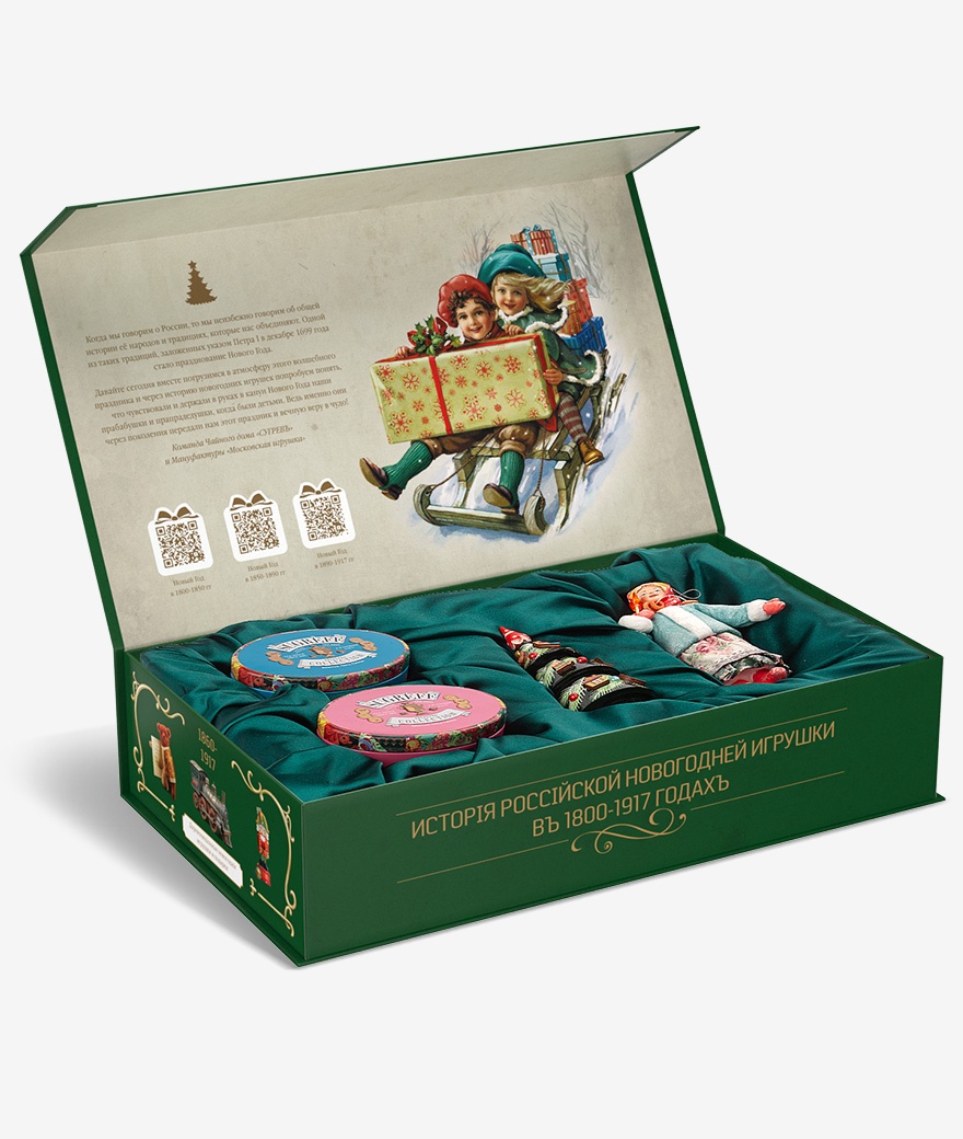 Полный комплект продукции включает чайные наборы с леденцами-монпансье в жестяных баночках, елку-матрешку из массива липы со снеговиком и Дедом-Морозом внутри, авторскую коллекционную ватную игрушку, книгу об истории елочной игрушки в дореволюционной России. Набор «Со старым Новым годом!» содержит иллюстрации новогодних подарков и елочных игрушек, популярных в России в период с 1800 по 1917 год.