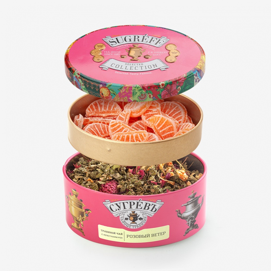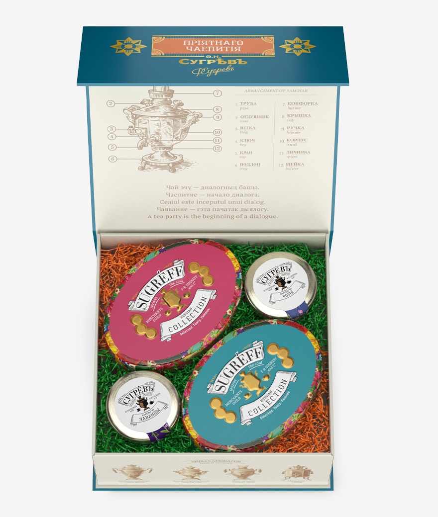 Набор задуман, как элегантный и вкусный подарок и представляет собой метафору букета из цветов. Он состоит из 2 цветочных чаев в брендированных жестяных банках СУГРЕВЪ и 2 натуральных варений из лаванды и розы.