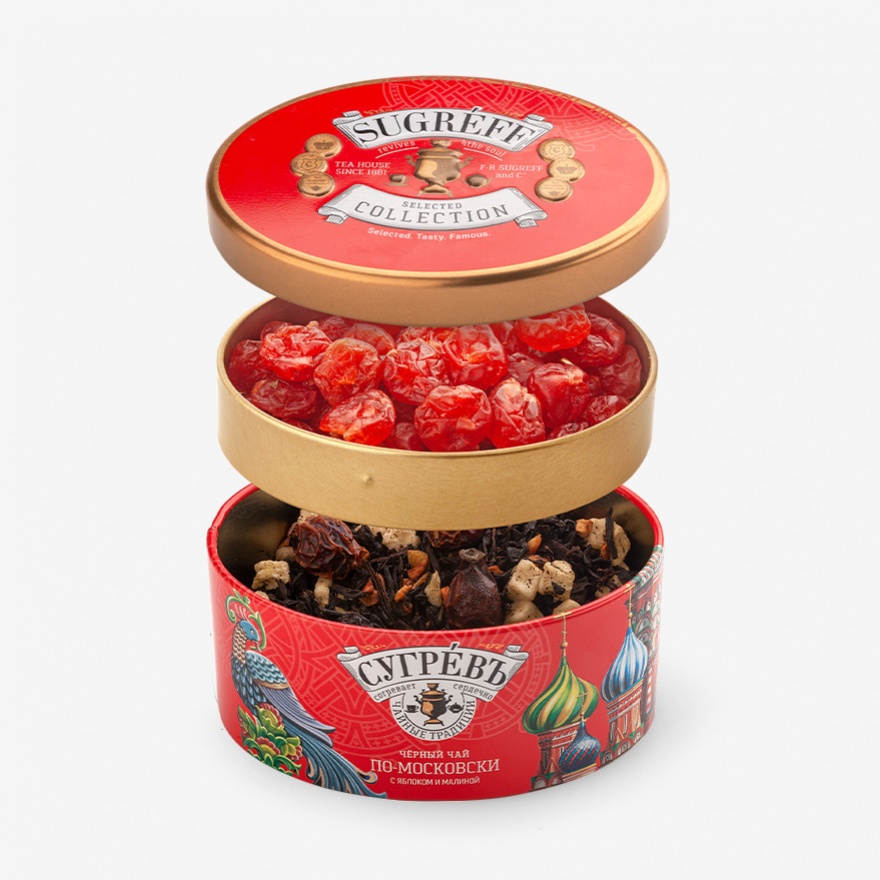 Чайный напиток по-Московски: Чай черный, сублимированные кусочки яблока , ягоды шиповника, ягоды вишни, медовые гранулы.