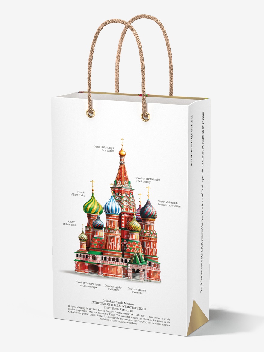 Подарочный набор из шести эксклюзивных купажей листового чая, трав и ягод, характерных для разных регионов России, в стильном саше из ламинированного картона с выборочной лакировкой и ручками из плетёного шнура. На оборотной стороне саше изображены представители различных этнокультурных групп в традиционных костюмах с подписями на английском и русском языках.