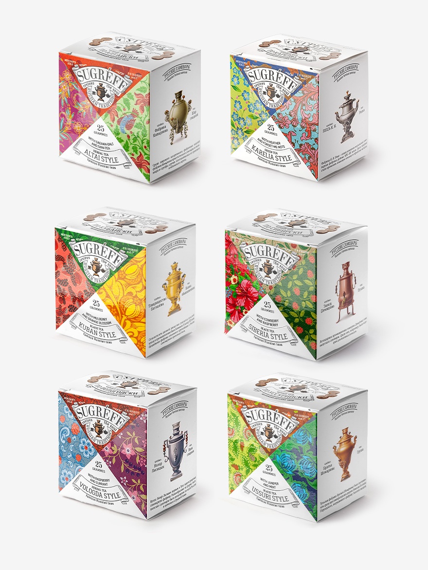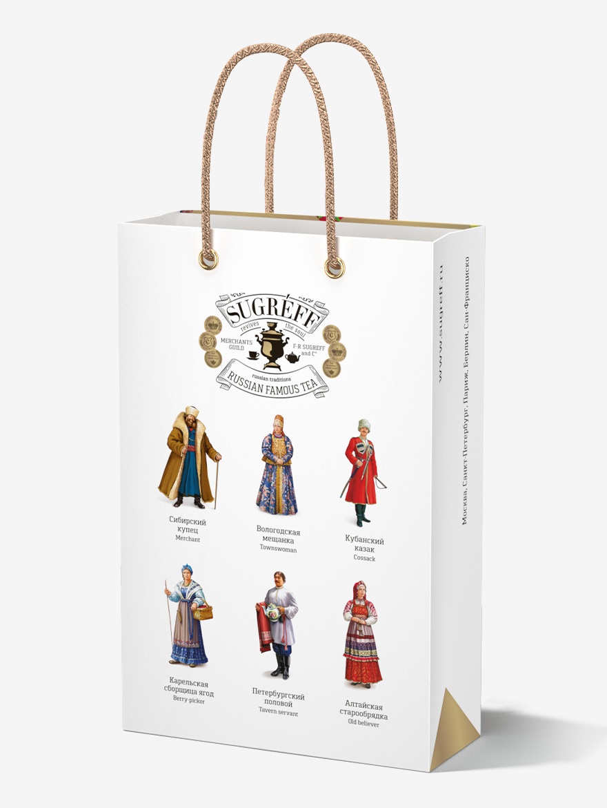 Подарочный набор из шести эксклюзивных купажей листового чая, трав и ягод, характерных для разных регионов России, в стильном саше из ламинированного картона с выборочной лакировкой и ручками из плетёного шнура. На оборотной стороне саше изображены представители различных этнокультурных групп в традиционных костюмах с подписями на английском и русском языках.