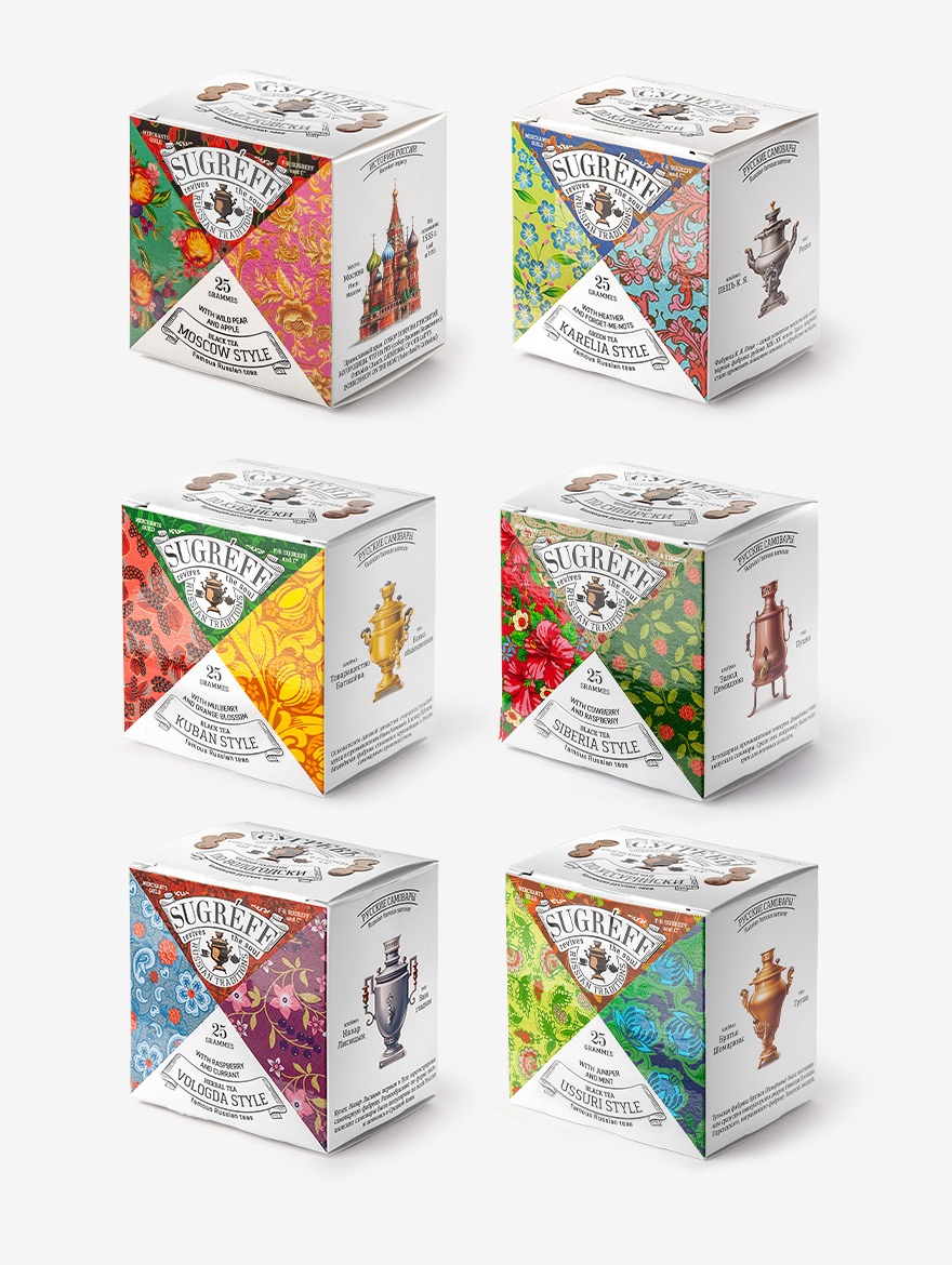 Внутри — ассорти из шести чаев: от насыщенных чёрных с ягодами до деликатных зелёных с лепестками и травами. Каждая смесь — это отдельное маленькое путешествие по регионам России: по‑Московски, по‑Карельски, по‑Кубански, по‑Сибирски, по‑Вологодски, по‑Уссурийски.
