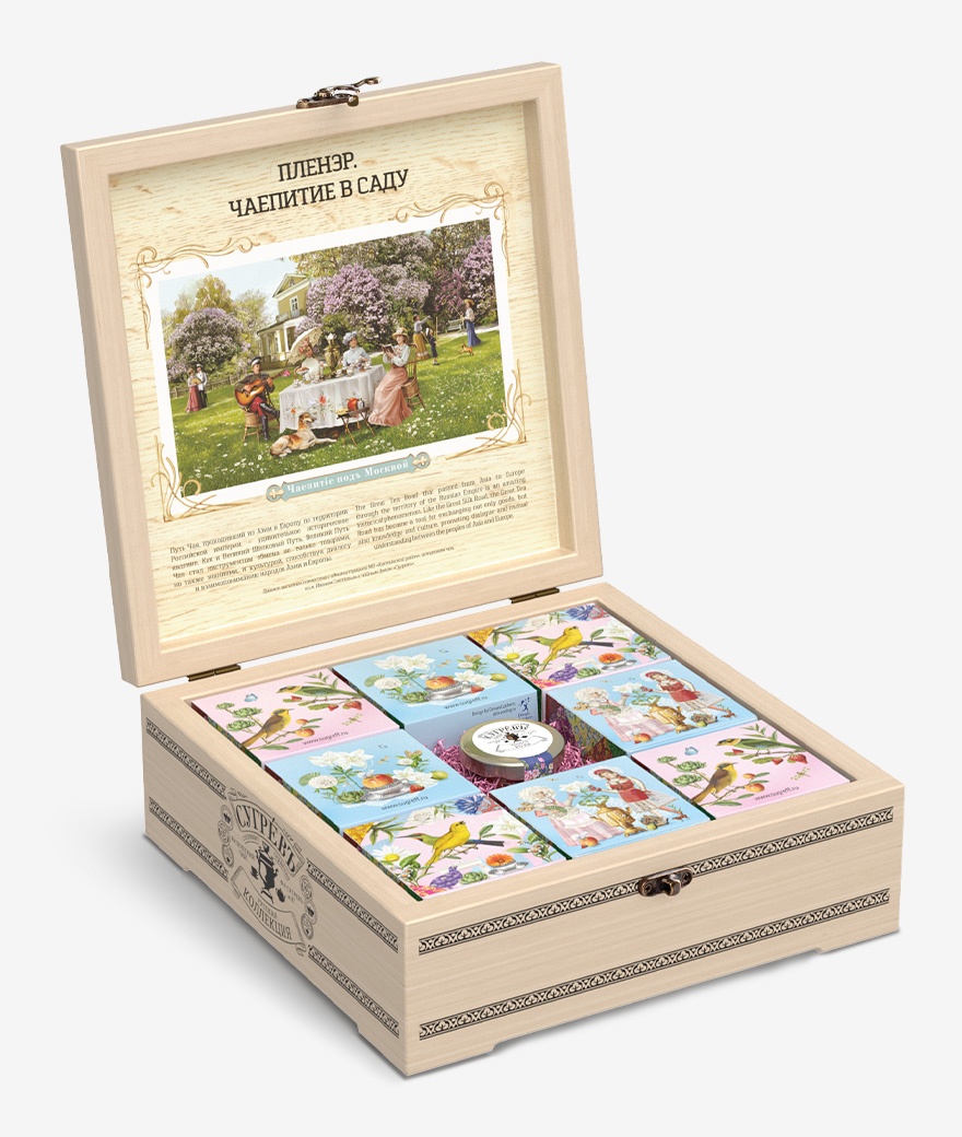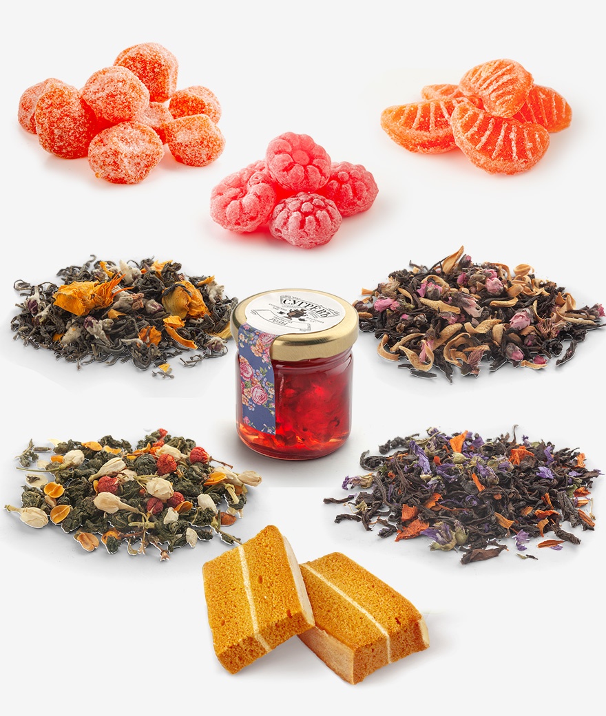 Купажи цветочных чаев составлены так, чтобы сочетать вкус и аромат отборных сортов китайского и индийского чай с красотой разноцветных лепестков календулы, мальвы, цветов яблони, персика, жасмина, апельсина, акации. Ягодно-фруктовые десерты гармонично дополняют набор.