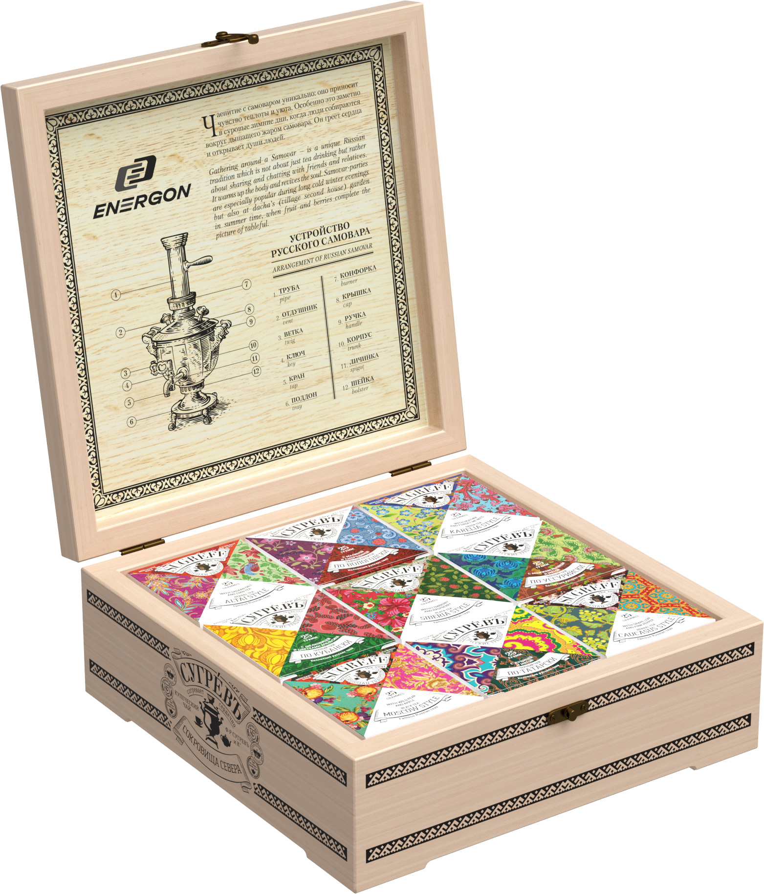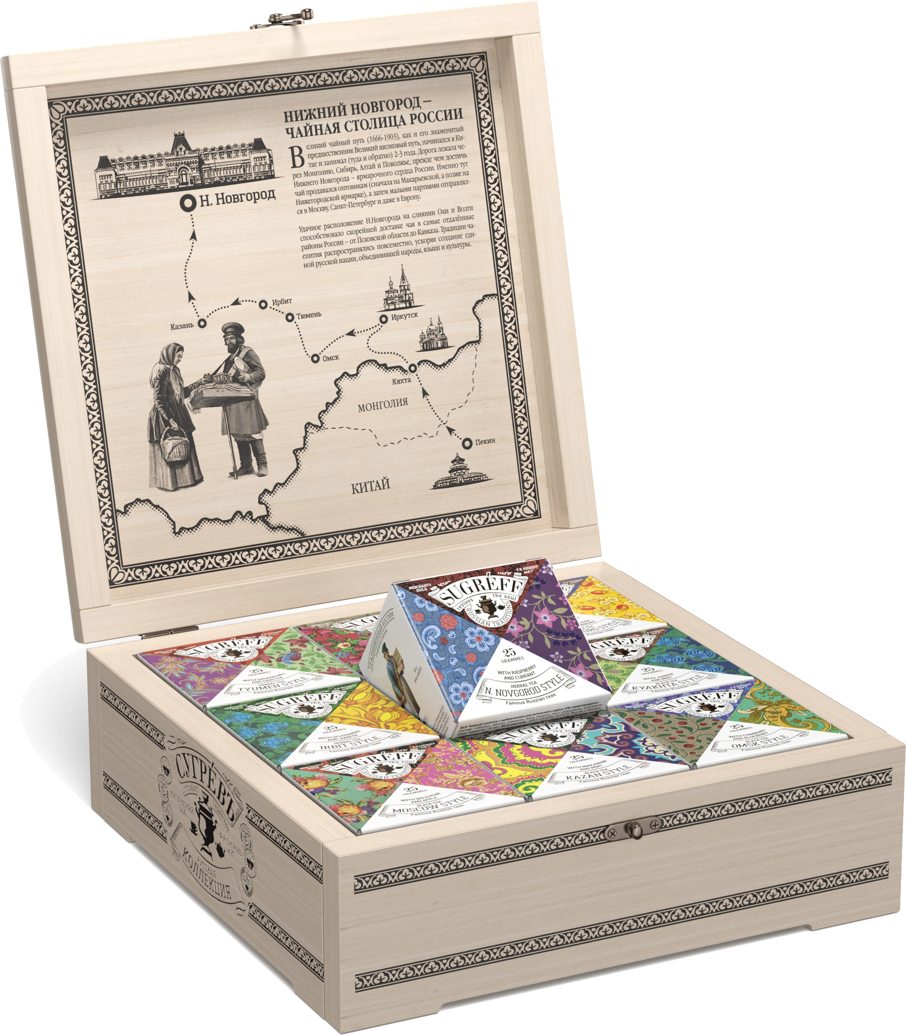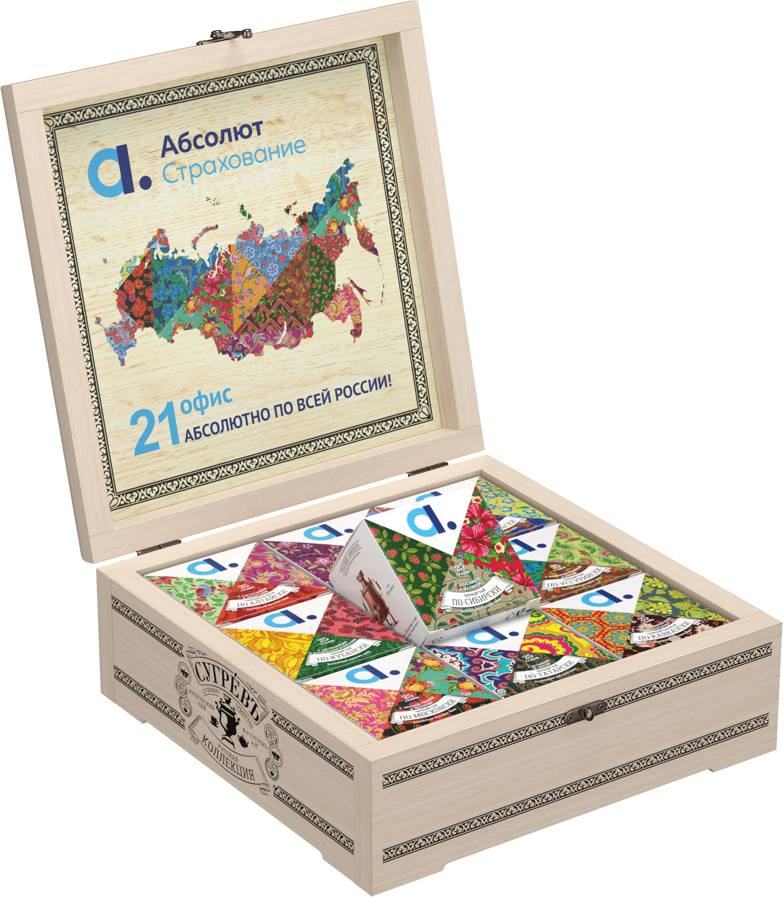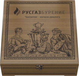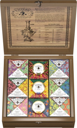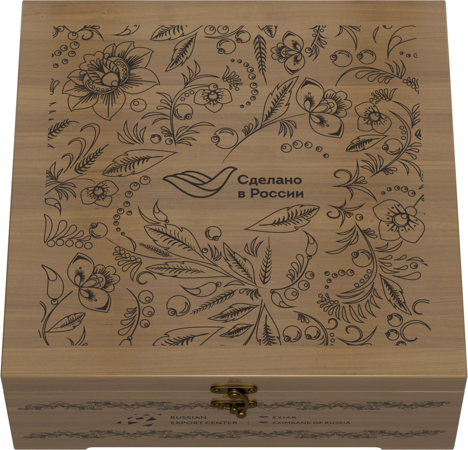 Тип вложения: тематический сувенир из России (матрешка, фарфоровые фигуры, изделия из бересты, шелковые платки и прочее), чайная посуда (чайный стакан, чайница), десертная группа из традиционных русских сладостей (мед, варенье, пастила, пряники, орехи, ленедцы, сухофрукты и прочее), предметы декора (свечи, текстиль)) с ограничением по размеру не более В70*Ш70*Г55 мм для размещения в качестве центрального элемента и не более В180*Ш70*Г55 мм для вертикального/горизонтального размещения. Предметы могут быть размещены как в декоративном мешочке, так и в доступном виде с подложкой из мишуры, либо для них может быть изготовлен ложемент. Тираж: не менее 20 штук.